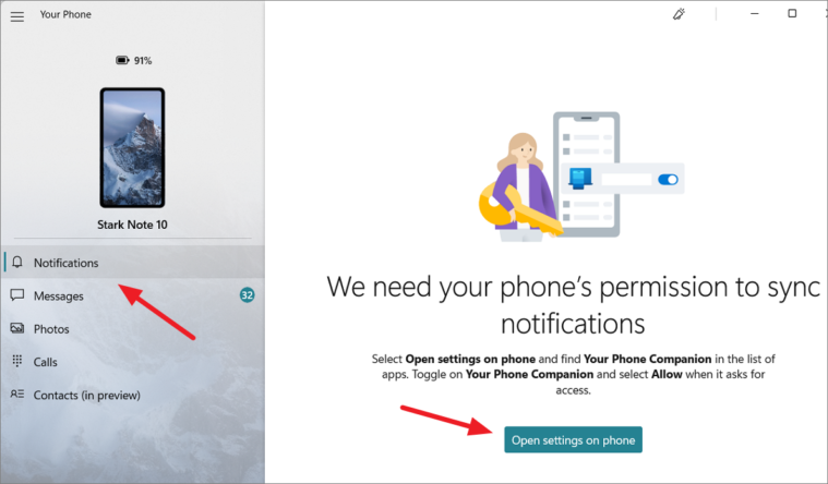 - In the 'Your Phone' app on your PC, select the Notifications tab and click Open settings on phone.