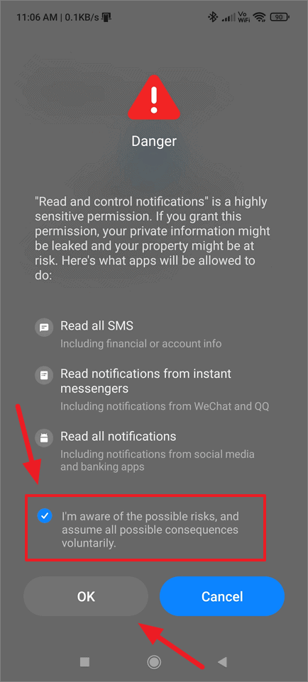 - A notification will appear on your phone requesting permission. Tap it to open Notification access.