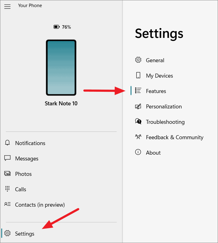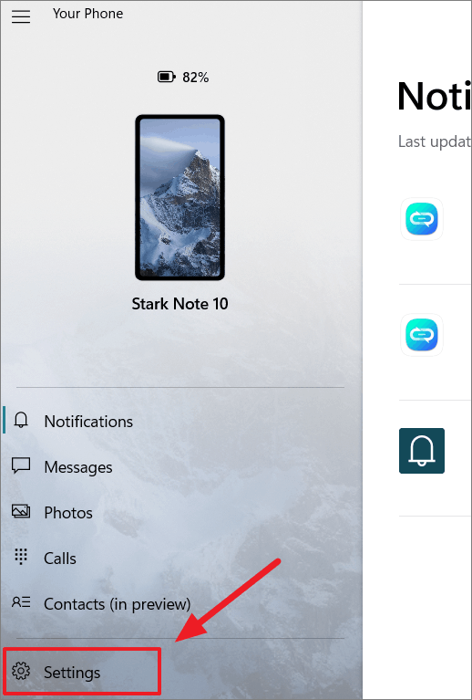 - In the 'Your Phone' app on your PC, click Settings at the bottom of the left sidebar.