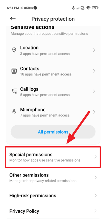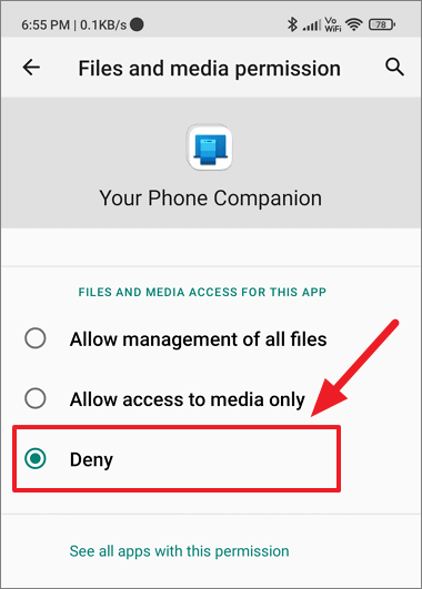 - Choose Files and media (or any other permission) and select Deny to revoke access.