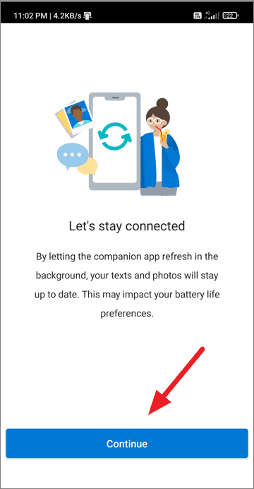 - After linking, you'll need to grant permissions. Tap Continue and then Allow for each permission request to provide access to your contacts, messages, calls, and media.