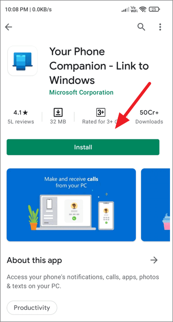 - On your Android phone, open the Google Play Store and search for Your Phone Companion – Link to Windows. Alternatively, visit aka.ms/yourpc in your phone's browser to be directed to the app. Tap Install to download it.