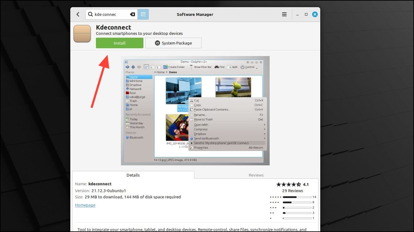 The KDE Connect app allows your Android device to communicate with your Linux computer. To install it: