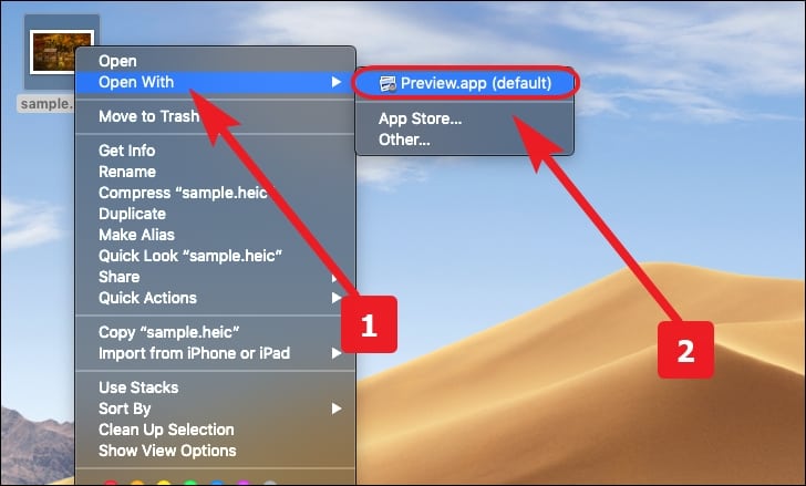 Open the image you want to convert with the ‘Preview’ app. If ‘Preview is not your default picture viewer. You can secondary click on the image and locate the ‘Open with’ option and click on ‘Preview. app’ from the list.