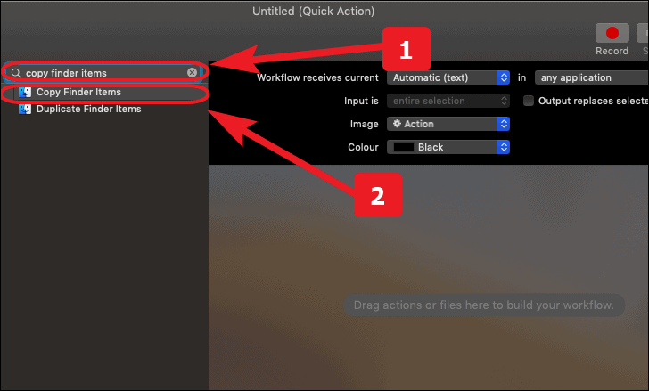Next, type ‘Copy finder items’ in the search bar located on the left section of the window. Then, drag or double click the ‘Copy finder Item’ to add it to the current workflow.