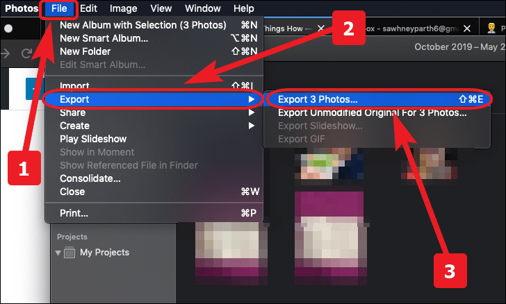 Now, go to the ‘File’ tab from the menu bar and navigate to the ‘Export’ option. After that, click on the ‘Export 3 Photos’ option from the list. Alternatively, you can also press and hold Shift+Command+E to export.