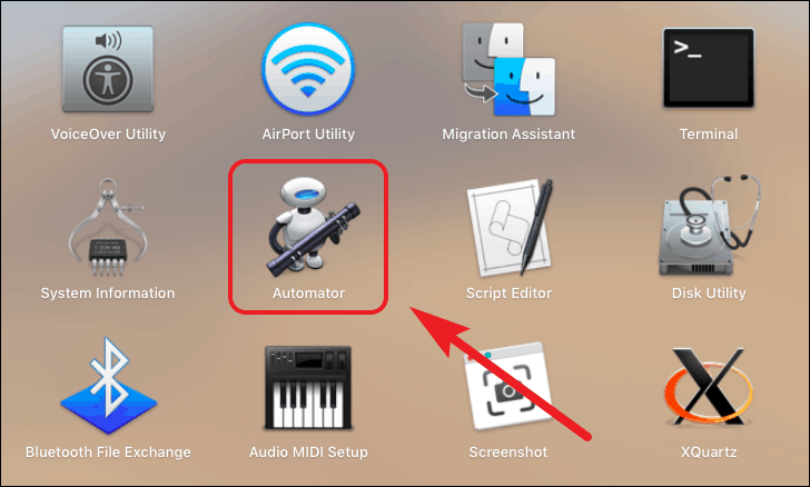 First, launch Automator from Launchpad. If you do not know the location of it, try looking in the ‘Other’ folder. Otherwise, you can also search for ‘Automator’ using spotlight by pressing command+space.