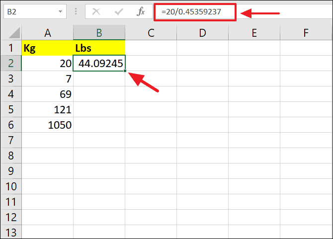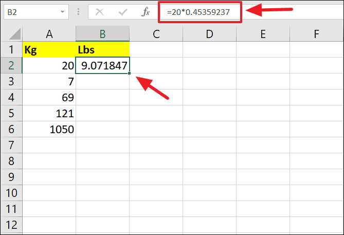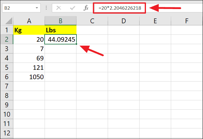 Step 2: Press Enter to see the result in pounds. For example, if you're converting 20 kilograms, your formula would look like: