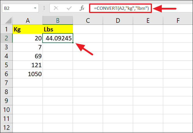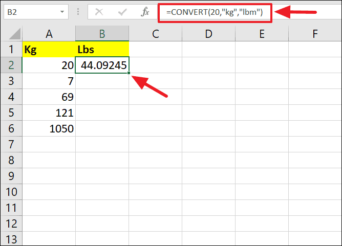 =CONVERT(number, "kg", "lbm")Replace number with the cell reference or the numerical value in kilograms that you wish to convert.