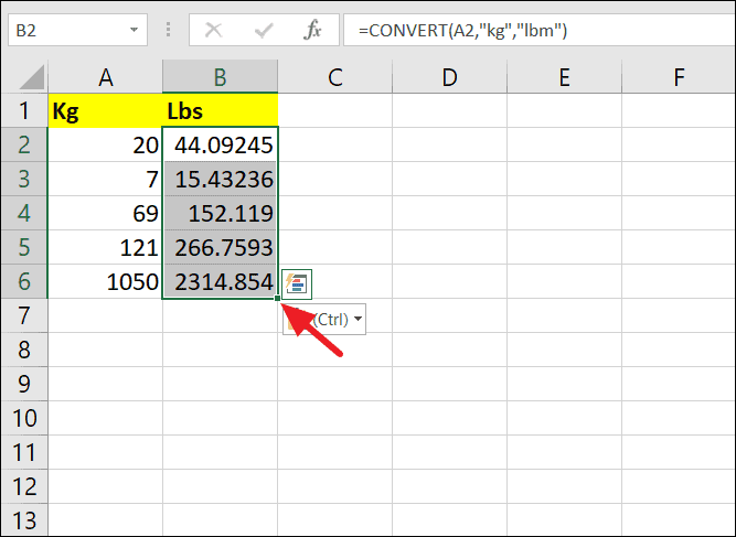 Step 4: To convert multiple values, use the fill handle to drag the formula down to other cells.