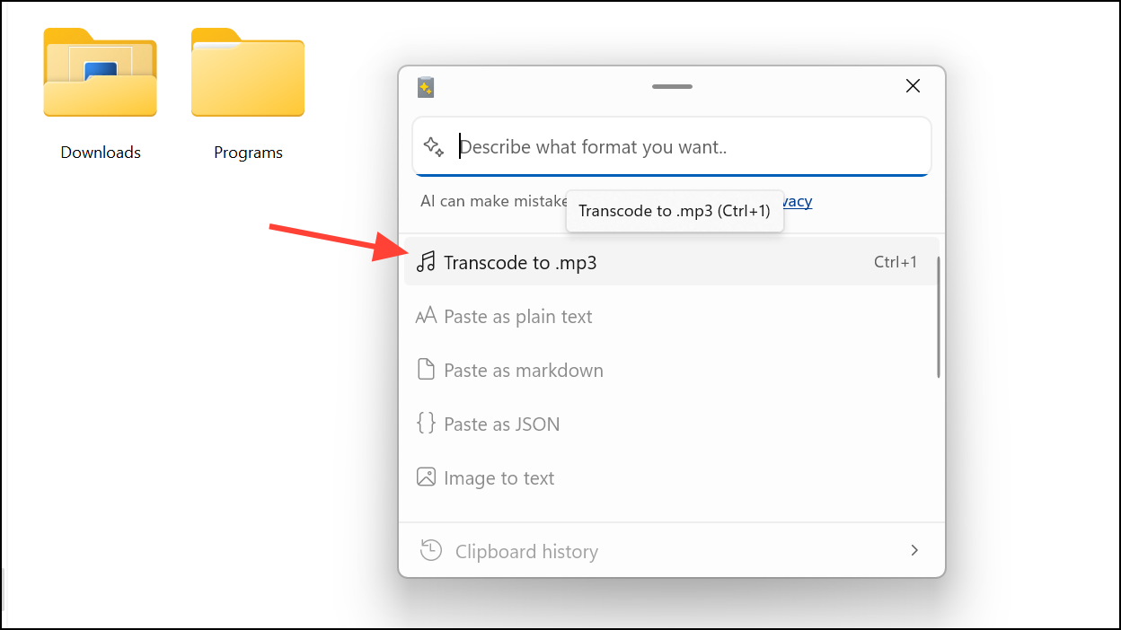 Step 3: Navigate to the folder where you'd like the converted file to appear. Open the Advanced Paste menu by pressing Windows + Shift + V. You'll see new options such as "Transcode to .mp3" for audio extraction or "Transcode to .mp4 (H.264/AAC)" for video conversion.