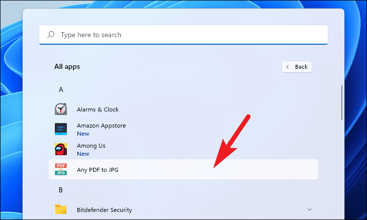 - Scroll through the list and click on the Any PDF to JPG app to launch it.