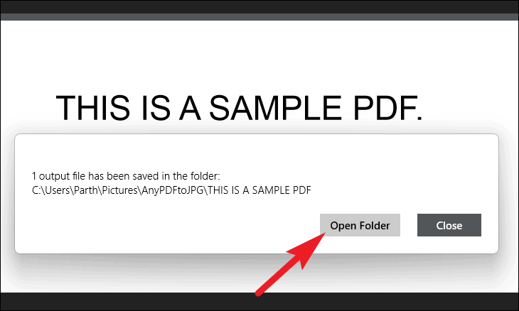 - Once the conversion is complete, a confirmation pane will appear. Click on Open Folder to access the converted JPG files, or click on Close to exit.
