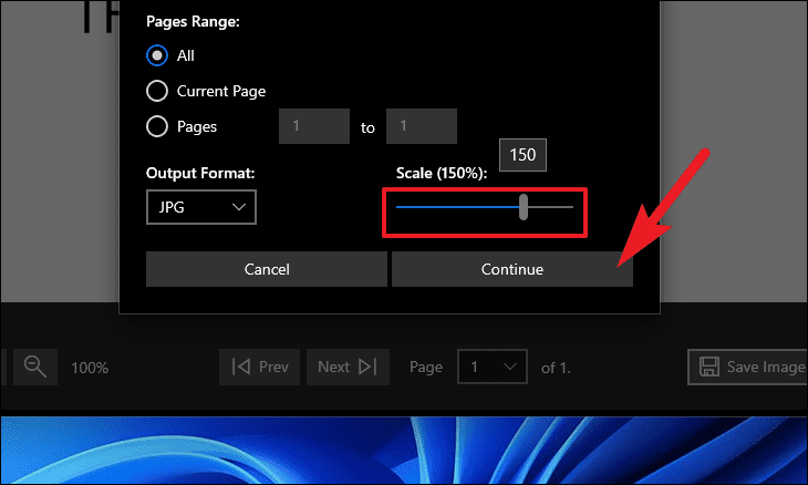 JPGas your desired format. - Adjust the Scale slider to set the image resolution relative to the original PDF.