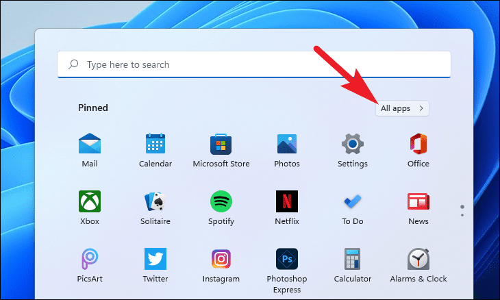 - Open the Start Menu and click on the All apps button at the top right corner.