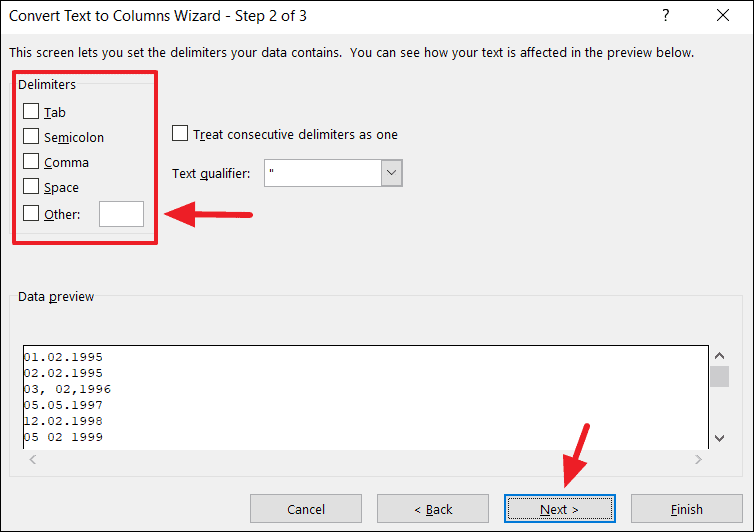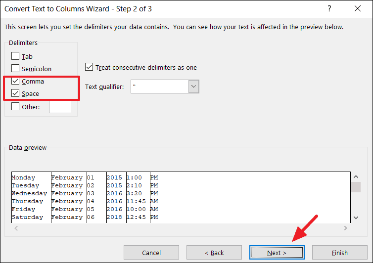 Step 4: Select the delimiters present in your text (e.g., comma and space) and click Next.