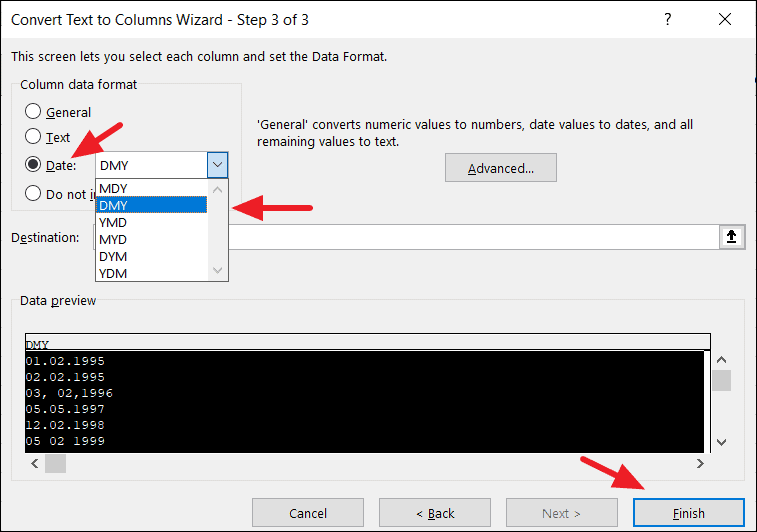 Step 5: In the final step, select General as the column data format for all columns. Specify a destination if you don't want to overwrite the original data, and click Finish.