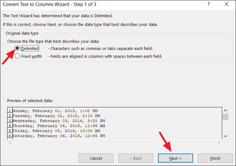 Step 3: In the Text to Columns wizard, choose Delimited and click Next.