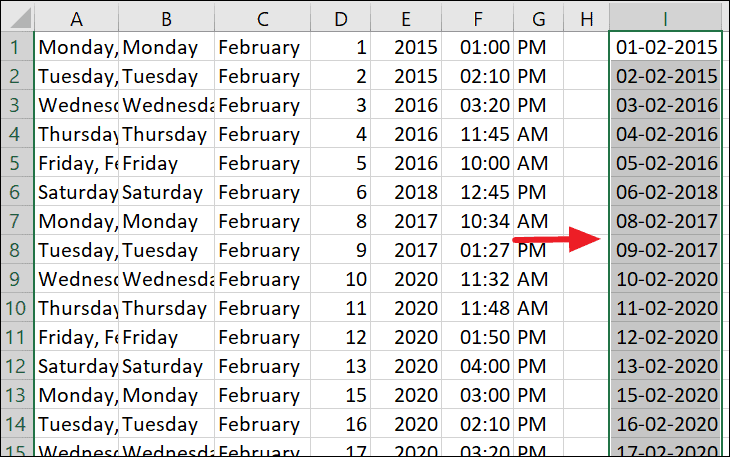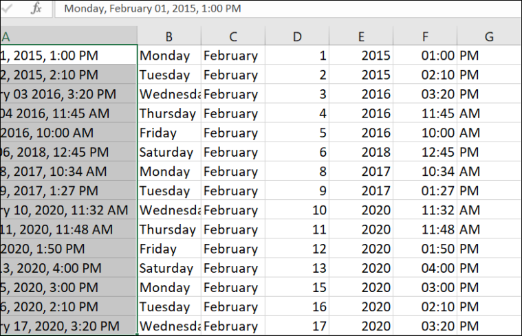For more complicated text strings, such as "Wednesday, February 01, 2020" or "February 01, 2020, 4.10 PM", the Text to Columns feature can help by splitting the text into separate components.