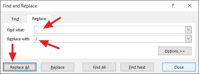 Step 3: In the Find what field, enter the existing delimiter (e.g., a period "."). In the Replace with field, enter a recognized delimiter such as a slash "/". Click Replace All and then Close.