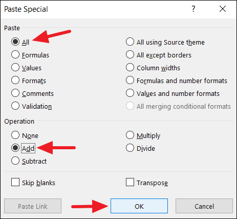 Step 3: In the Paste Special dialog box, select All under Paste and choose Add under Operation. Click OK.
