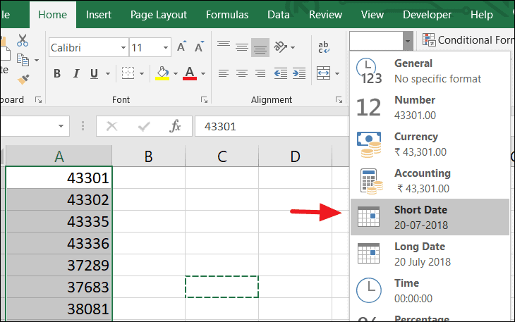 Step 4: Select the cells with the serial numbers. Go to the Home tab, click on the Number Format drop-down, and choose Short Date.