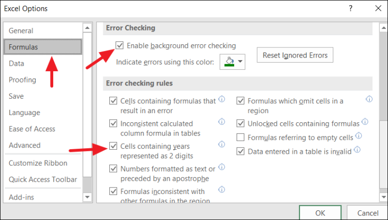 Step 2: In the Excel Options window, navigate to the Formulas tab. Under the Error Checking section, ensure that Enable background error checking is checked. Also, check the option for Cells containing years represented as 2 digits under Error checking rules.