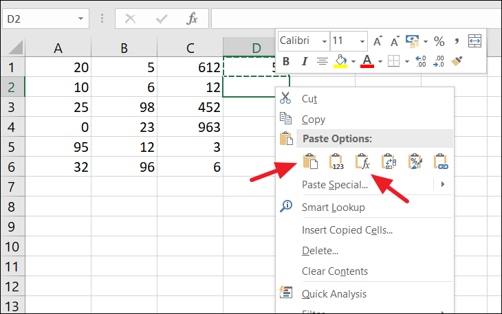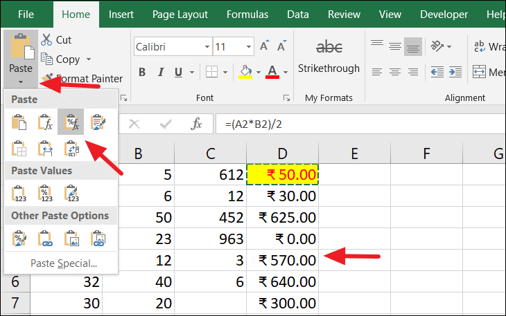 Step 3: Go to the 'Home' tab, click the arrow under 'Paste', and select 'Formulas & Number Formatting' (the icon showing % fx).