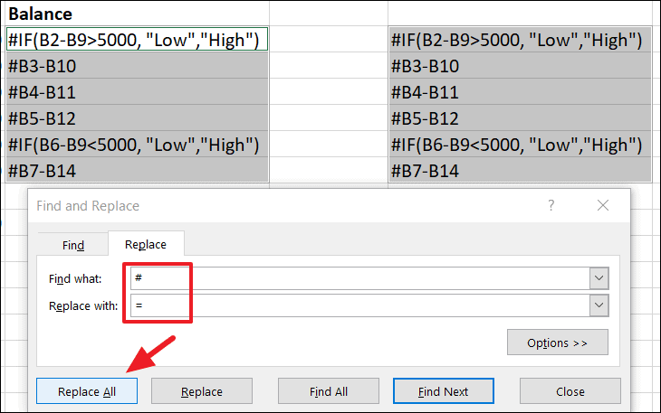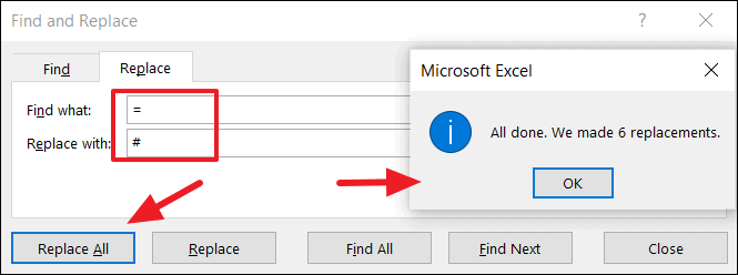 Step 3: In the 'Find what' field, enter =. In the 'Replace with' field, enter a unique character or string, such as #=, and click 'Replace All'. This converts your formulas to text strings.