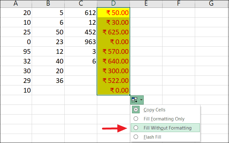 Step 3: Choose 'Fill Without Formatting' from the dropdown menu. This will apply the formula without altering the existing formatting of the destination cells.