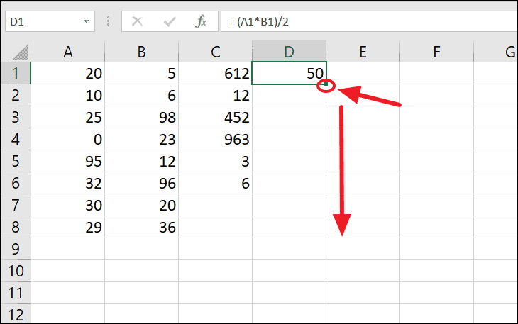 Step 3: Click and drag the Fill Handle down the column or across the row to apply the formula to the desired range of cells.