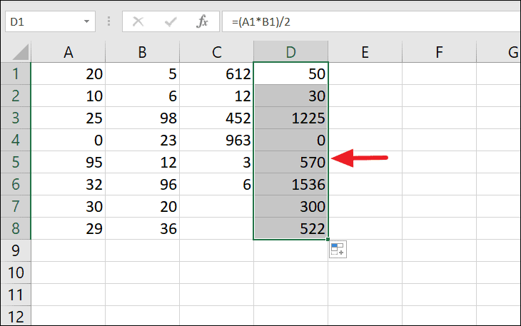 Step 1: Enter your formula in the initial cell. For example, suppose we have a table where we need to calculate values in column D based on columns A and B.
