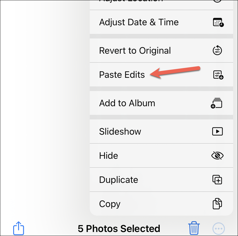 Finally, tap ‘Paste Edits’ from the menu to edit all the selected photos in one go.