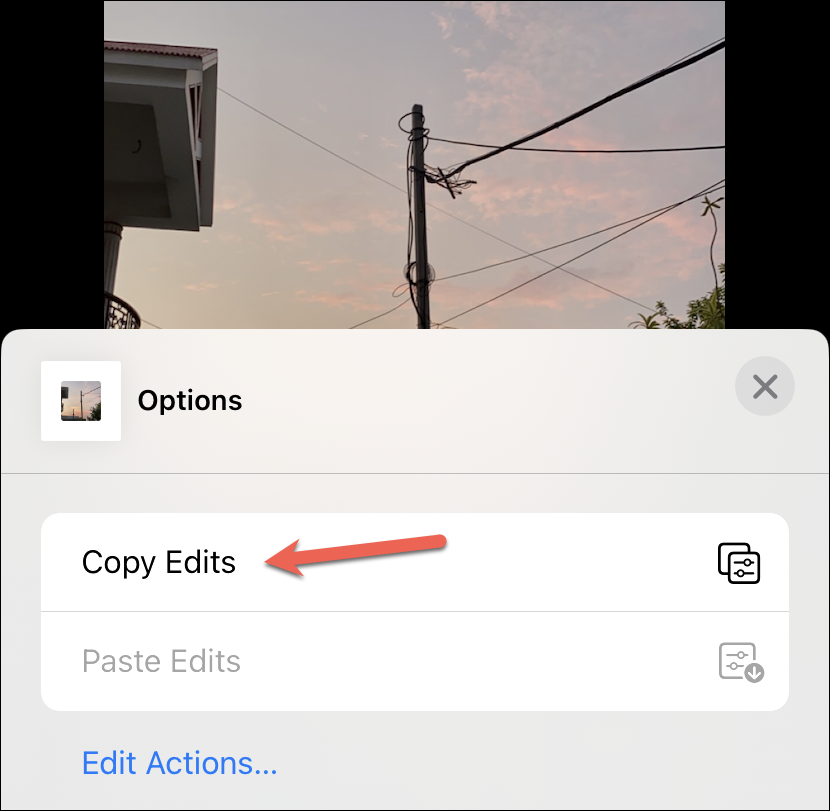You can easily copy the edits from any photo in the Photos app. But there are limitations on which edits you can copy. You can only copy and paste the edits you make using the adjustment (auto, exposure, brilliance, contrast, etc.) or filter tools. So, crop, markup, and other edits cannot be copied.