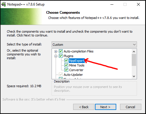 If you're installing or updating Notepad++, you can include the NppExport plugin during the installation process. Start by running the Notepad++ installer. Proceed through the setup until you reach the Choose Components window.