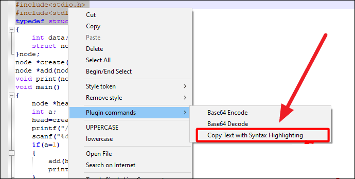 Step 2: Right-click on the selected text. From the context menu, hover over 'Plugins Commands' and then click on Copy HTML to clipboard or Copy RTF to clipboard depending on where you intend to paste it.