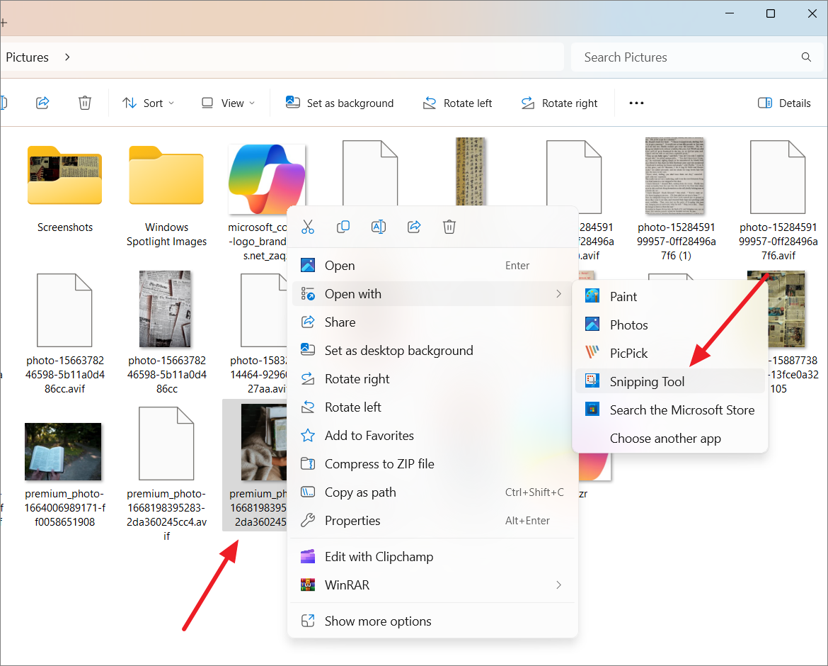 Step 2: Alternatively, to open an existing image with the Snipping Tool, right-click on the image file you wish to extract text from, hover over 'Open with', and select 'Snipping Tool'.