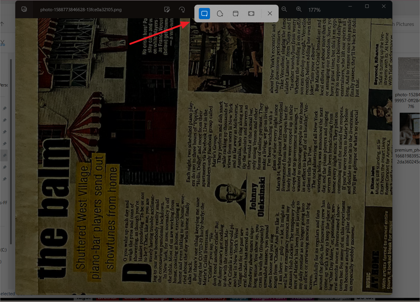 Step 3: Once the image is open in the Snipping Tool, click on the 'Text actions' button (represented by a rounded square icon with three lines) located on the toolbar.
