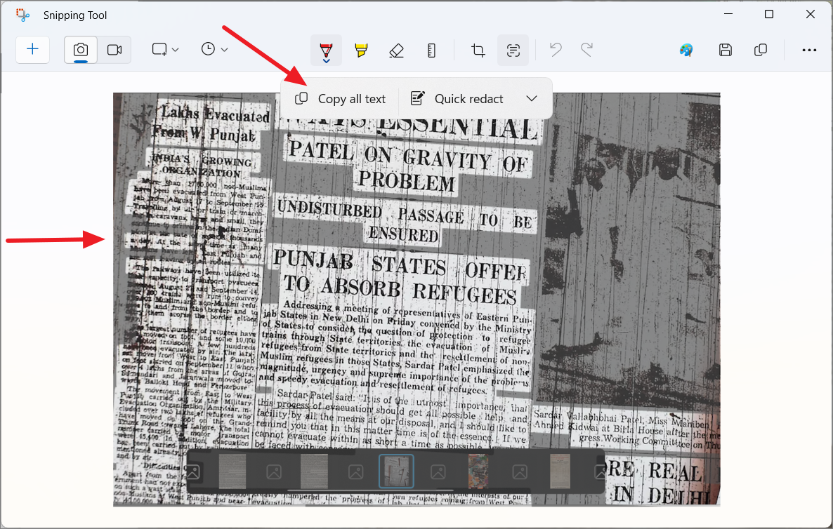 Sometimes, the Snipping Tool may have difficulty extracting text if it's too small or unclear. For example, it might struggle with text in a collection of newspaper clippings due to the small font size.