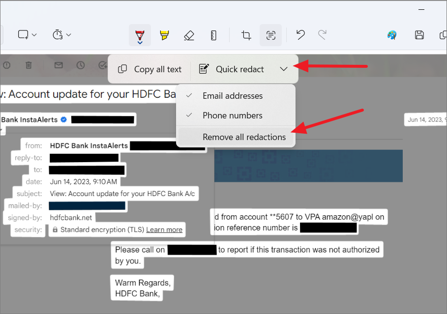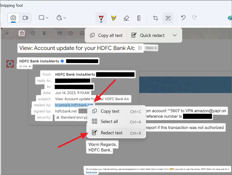 Redacting text in the Snipping Tool