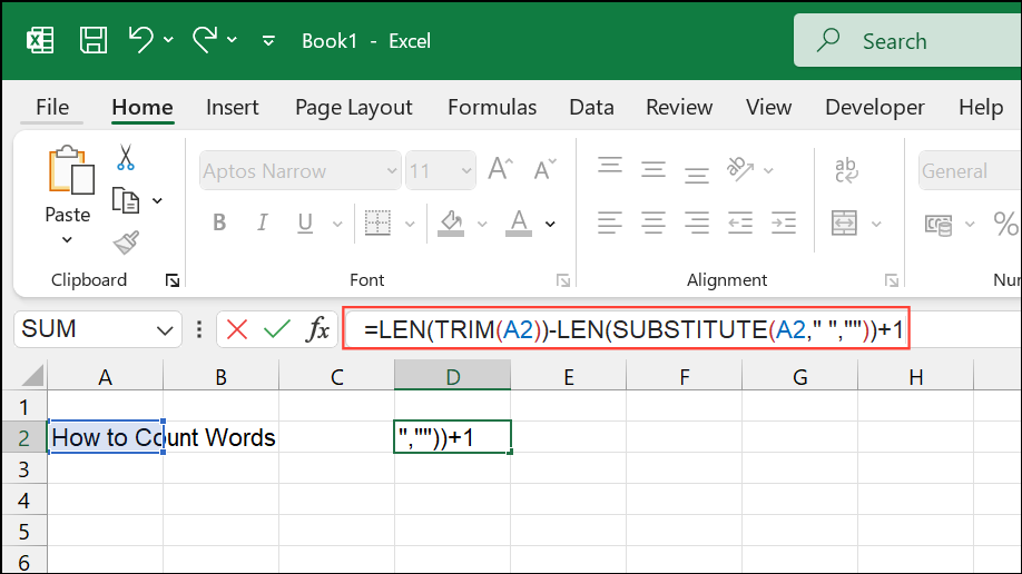 Step 2: In a blank cell, input the following formula to count the words: