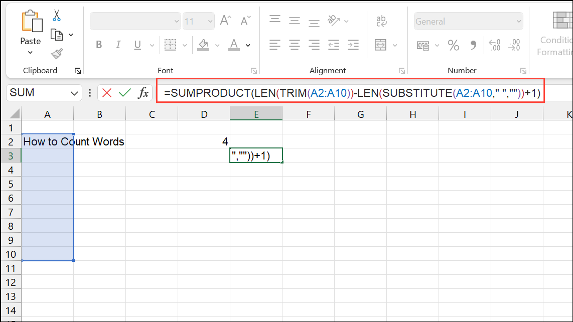 To count all words in a group of cells, such as a column of comments or descriptions, extend the single-cell formula to cover a range.