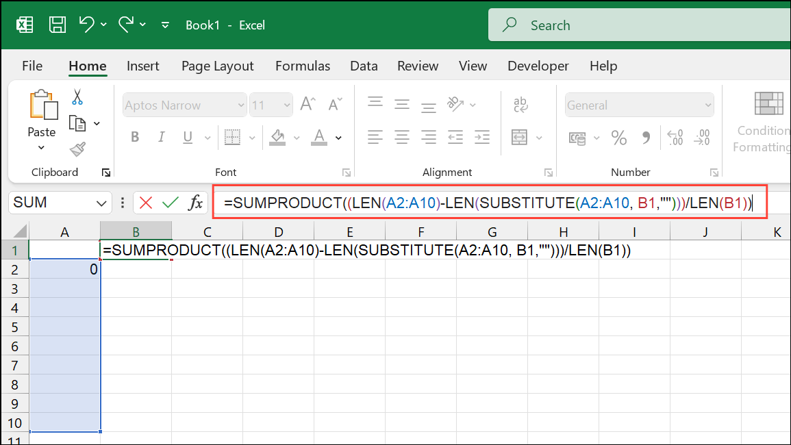 =SUMPRODUCT((LEN(A2:A10)-LEN(SUBSTITUTE(A2:A10, B1,"")))/LEN(B1))