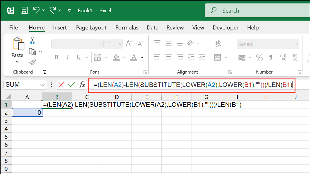 =(LEN(A2)-LEN(SUBSTITUTE(LOWER(A2),LOWER(B1),"")))/LEN(B1)