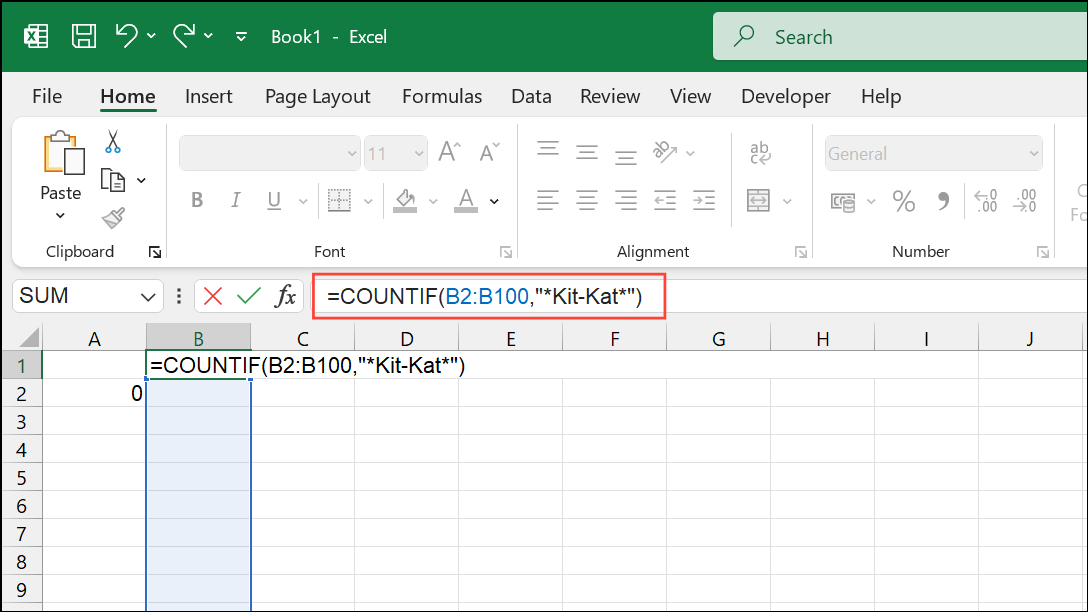 Step 1: Enter the following formula to count cells containing "Kit-Kat" anywhere in the text within B2:B100: