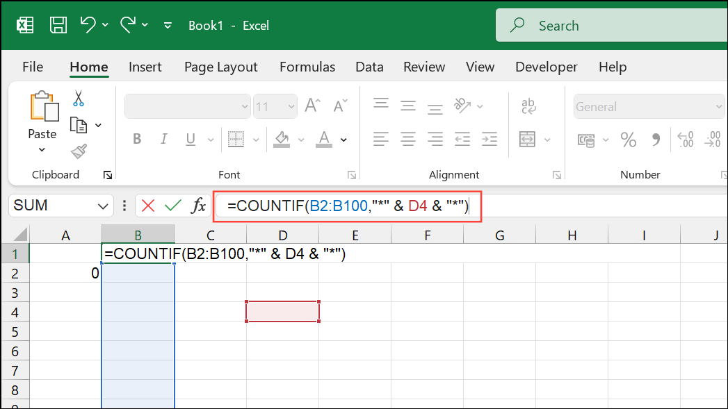 =COUNTIF(B2:B100,"*" & D4 & "*")