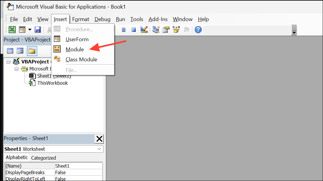 Step 2: In the editor, go to Insert > Module and paste the following code: