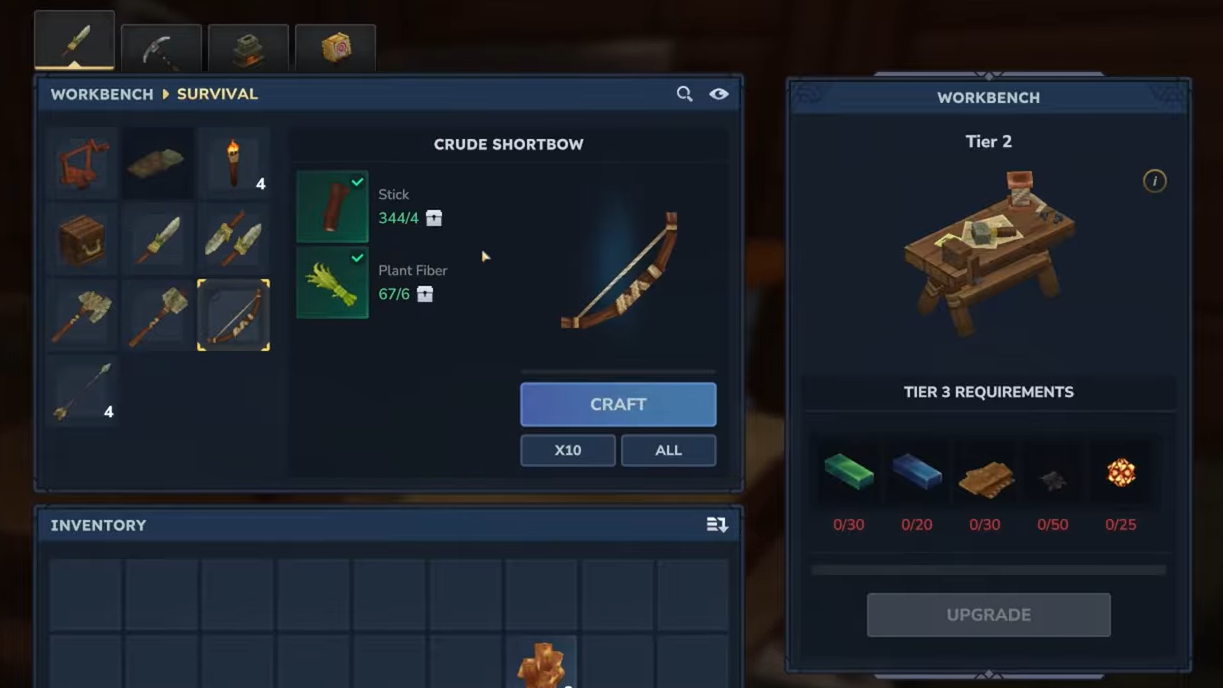 Step 4: Interact with the Worktable to open its crafting menu, then select the bow recipe using your 4 Sticks and 6 Plant Fiber to craft one bow.