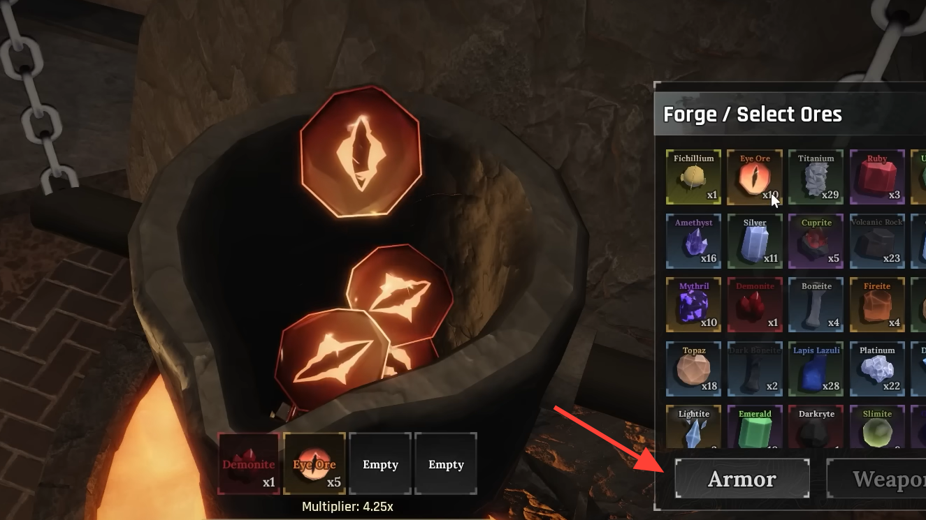 Step 3: Drag in at least three ores. The total ore count and the rarity of each ore determine two things: whether you hit Light, Medium, or Heavy armor, and the stat multiplier/trait count on the result.