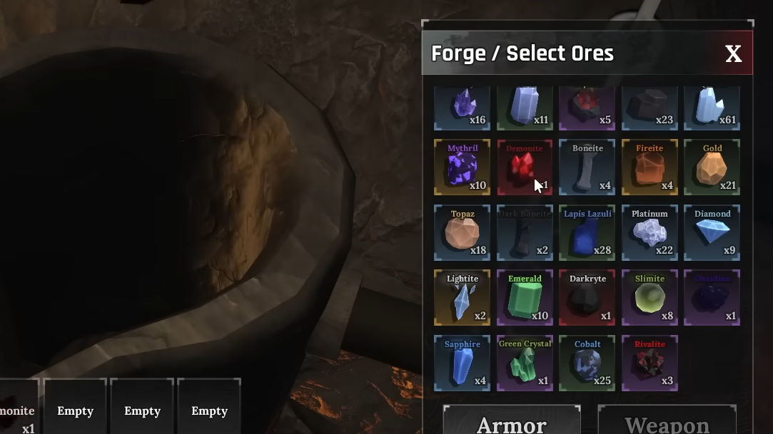 Epic and Legendary ores are limited, especially if you are still in midgame. One practical approach is to target Dark Knight armor using only “rare” ores such as Sapphire, Amemes (Amethyst), Topaz, and generous amounts of Quartz as filler. That way, you save Lightite, Darkryte, and higher-end materials for later.